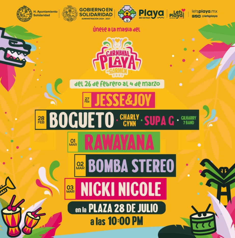 Las bandas confirmadas para este año son: Jesse & Joy, Bogueto, Charly Gynn, Supa G, Gilharry 7 Band, Rawayana, Bomba Stereo y Nicki Nicole, los cuales podrás disfrutar en la Plaza 28 de julio en Playa del Carmen.