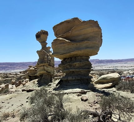 Por último, llegamos a “El Hongo”, la geoforma más icónica de Ischigualasto. Se trata de una masa rocosa con forma de pedestal que desafía la gravedad, demostrando el poder de la erosión. Está rodeado de pequeños “honguitos”.