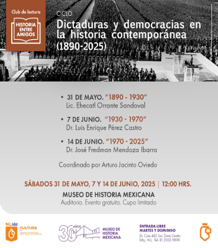 Seis Grados, México.- Museo de Historia Mexicana invita a participar en el nuevo ciclo del Club de Lectura Historia entre Amigos “Dictaduras y democracias en la historia contemporánea (1890-2025)”, un análisis de los momentos más representativos del tránsito político entre el autoritarismo y la democracia desde finales del siglo XIX hasta la actualidad, con la participación de especialistas en historia y ciencia política.